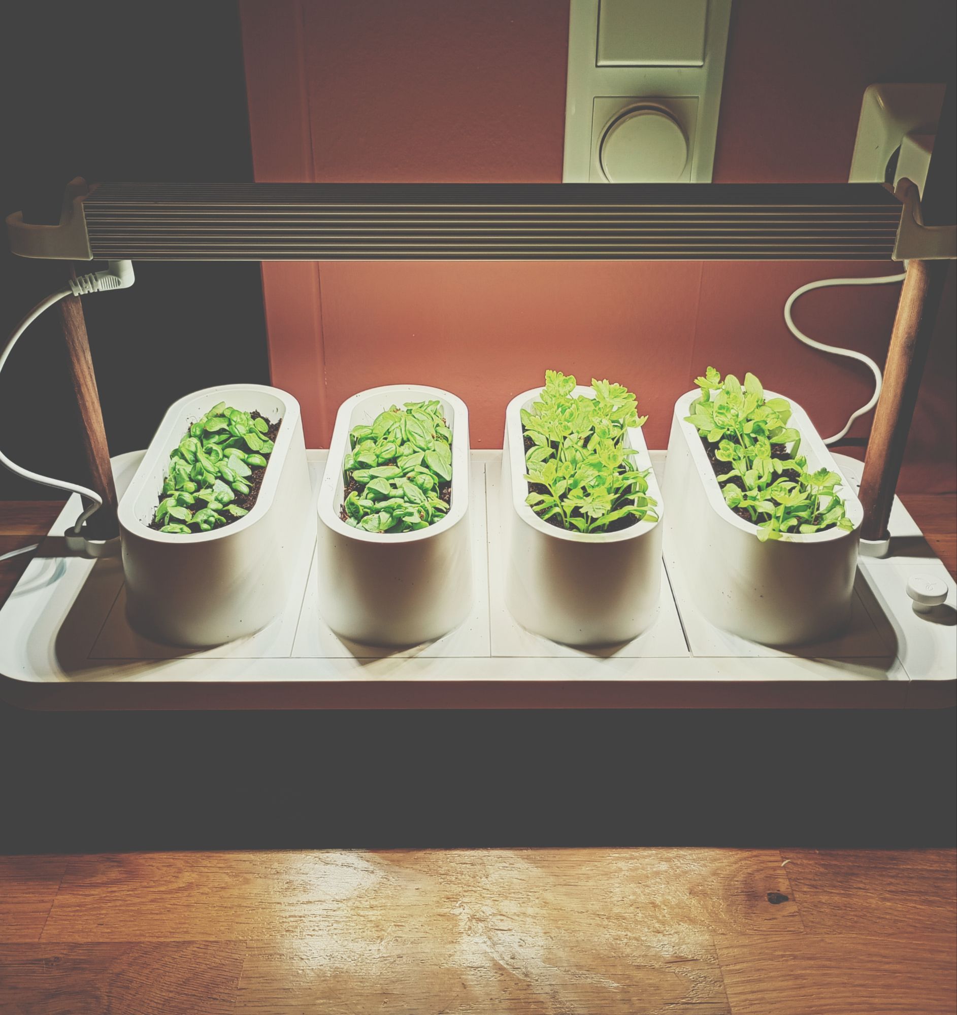 Ellers vokser det basilikum og bladpersille i min Auk mini. Det er en stund ennå til noe kan høstes, men det gror fint og med minimalt med anstrengelse fra min side. Jeg fylte på vann og plantenæring da jeg satte den opp (for flere uker siden og fortsatt er det tid til jeg trenger å gjøre det igjen), og har stilt inn lyset slik at det er på i 16 timer og av i åtte, som en døgnrytme. Og så hever man lampa etter hvert som plantene vokser. Det er det. De trives i 20-25 grader, og det er nok i alle fall ikke mer enn 20 grader i leiligheten min for tiden, noe som gjør at de kanskje vokser litt saktere enn de kunne ha gjort, men det virker enn så lenge å gå greit.